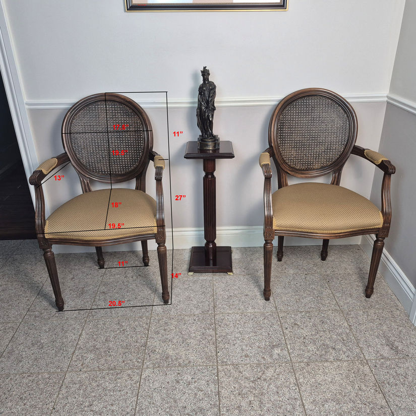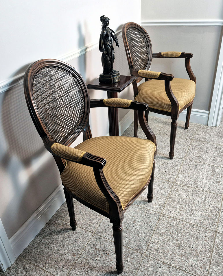 This impressive pair of original Louis XVI armchairs represents the pinnacle of Louis XVI design. Expertly crafted from hand-carved beech wood, the solid frame ensures stability, while the brown fluted legs draw attention. The supple and comfortable seat, along with the tight backrest, provides optimal support and comfort. Featuring gold-printed upholstery, these chairs make a striking statement and add a touch of exotic allure. The intricately carved armrests enhance their charm, making these chairs a definitive statement piece for any home. Elevate your living space with the Louis XVI Oval Back Accent Armchair. This chic and distinctive armchair is a stylish addition to any decor, will it be the office or the living room.